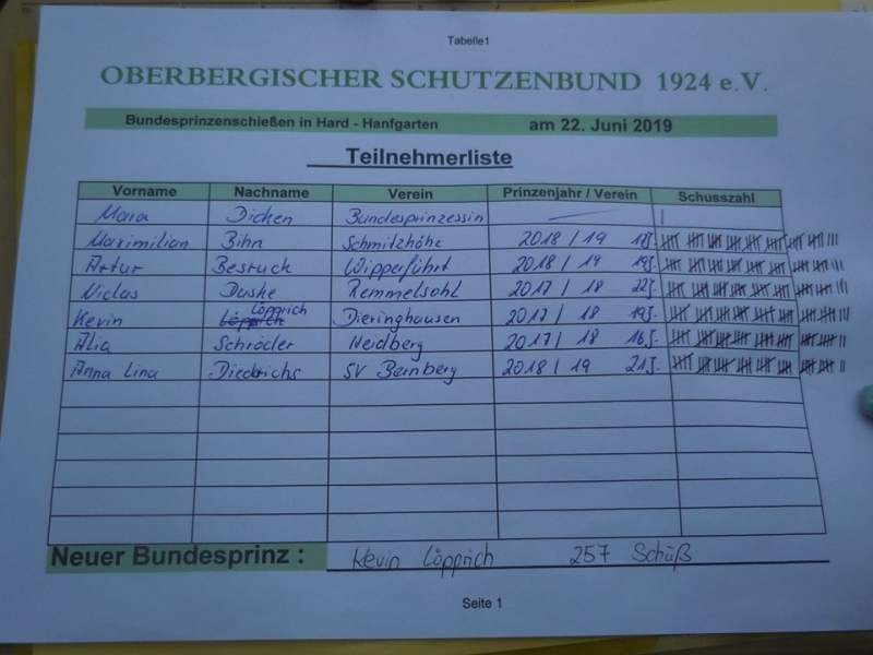 Am Samstag, den 22. Juni 2019 konnten wir alle stolz sein auf das was unser Schützenbruder Kevin Löpprich geleistet hatte. Der neue OSB Bundesprinz kommt somit aus unseren Reihen und heisst Kevin Löpprich! Zu seiner Seite nahm er Alina Tump als Bundesprinzessin. Herzlichen Glückwunsch nochmal an dieser Stelle! |