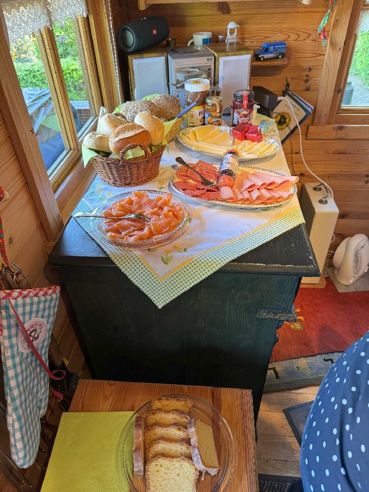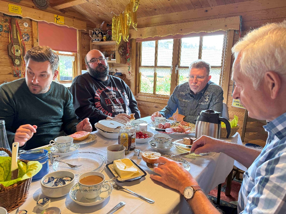 Gestartet wurde traditionsgemäß mit einem üppigen Frühstück beim Hofmarschall Tim Trelle, der in Vertretung für unseren König Mario Dresbach – der sich im Campingurlaub befand – die Gastgeberrolle übernahm. Das Frühstück selbst wurde jedoch großzügig von unserem König gesponsert – an dieser Stelle ein herzliches Dankeschön, Mario! Von feinem Lachs bis herzhaftem Mett war alles dabei, was das Schützenherz begehrt. Der Auftakt wurde stilecht mit einem kühlen Bierchen abgerundet – so konnte der Tag beginnen!